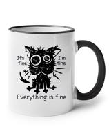 Keramický hrnek s potiskem kočky Everything is fine zaručeně rozesměje každého. Pokud hledáte skvělý dárek na narozeniny, Vánoce nebo jen tak pro radost, právě jste našli ten pravý dárek. Potisk perfektně vynikne na bílém hrníčku s černým uchem, ale vedle nešlápnete ani s jinou barevnou variantou. Do práce je tento hrnek jako stvořený! Ukaž všem, že zvládnout stres je pro tebe malina.